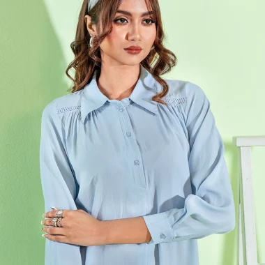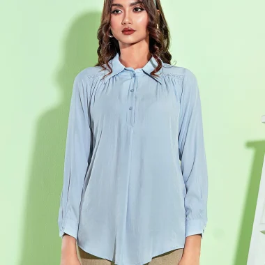 Viscose casual top has shirt collar, front yoke has join lace details & gather, has center front button placket details, has full sleeve with cuff, has curve hemline.