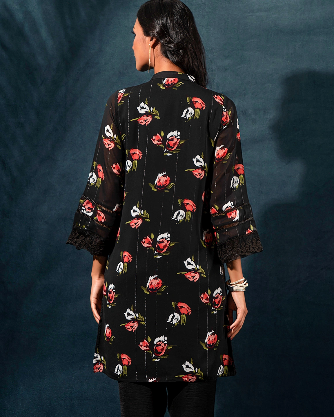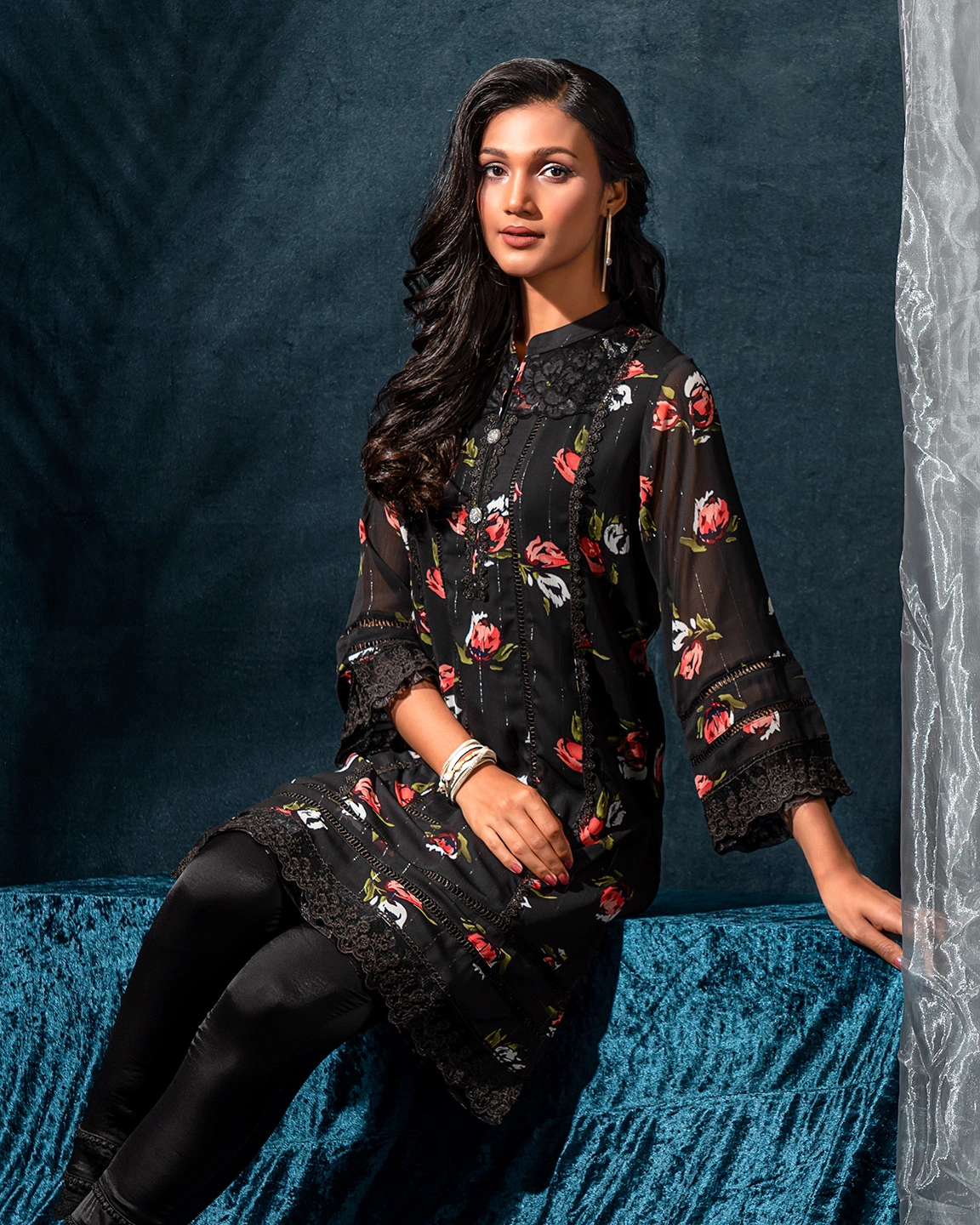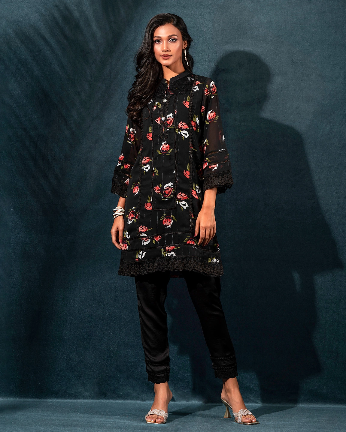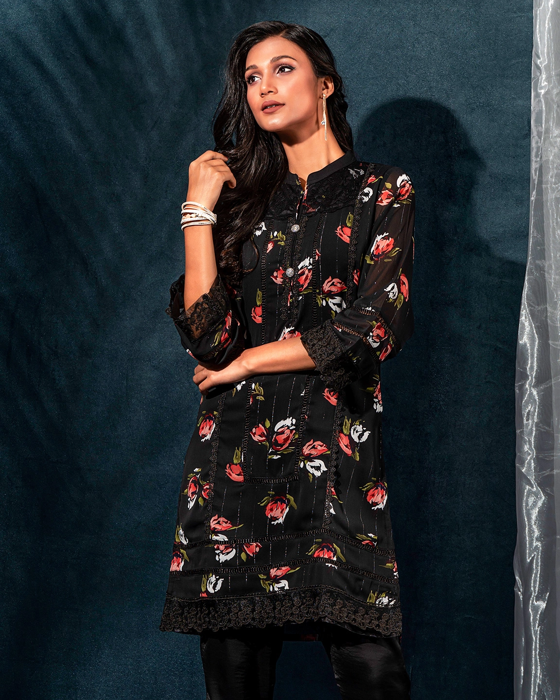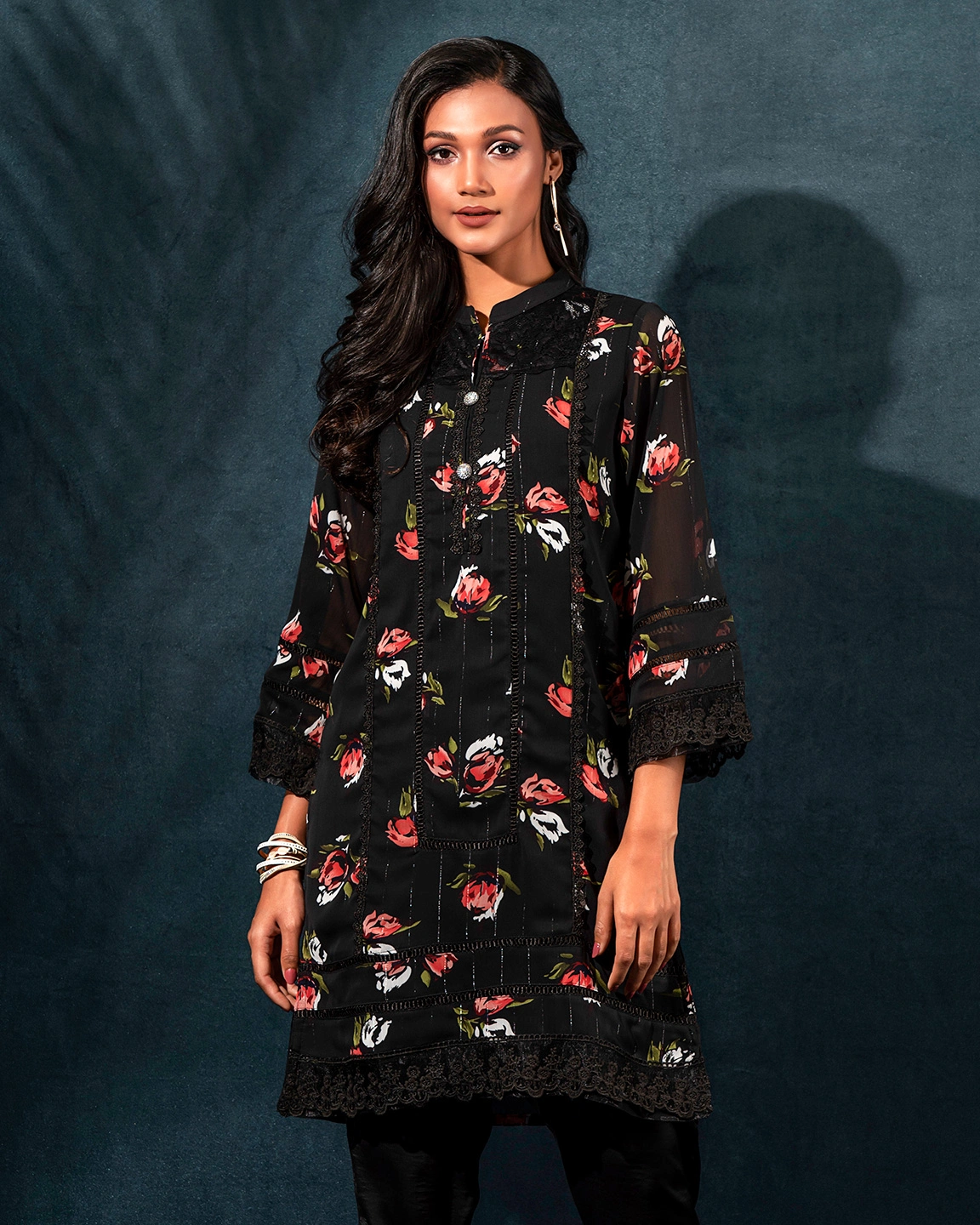 Sold OutFemale Front Yoke Lace Details Short Kamiz | Black