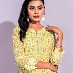 Luxury Georgette Short Kamiz has Curved-V- neck with lace details , has front princes lace details, hemline has contrast panel with lace details, has full wide sleeve has hemline lace details, has backside lace details, has bothside slits, has butter linning for comfort & easy.