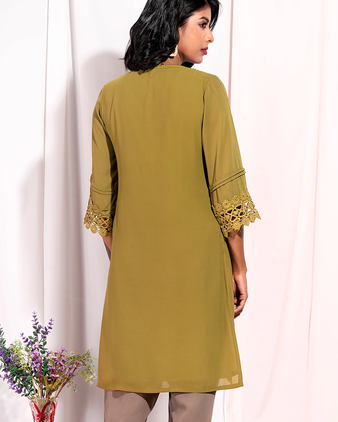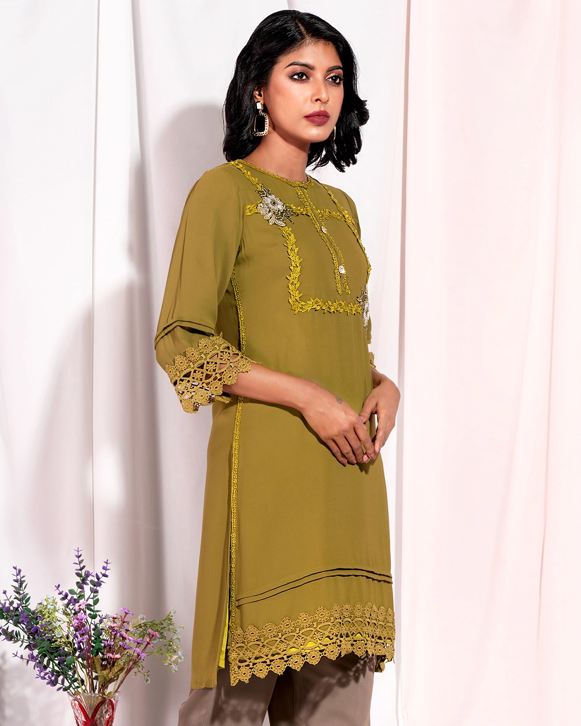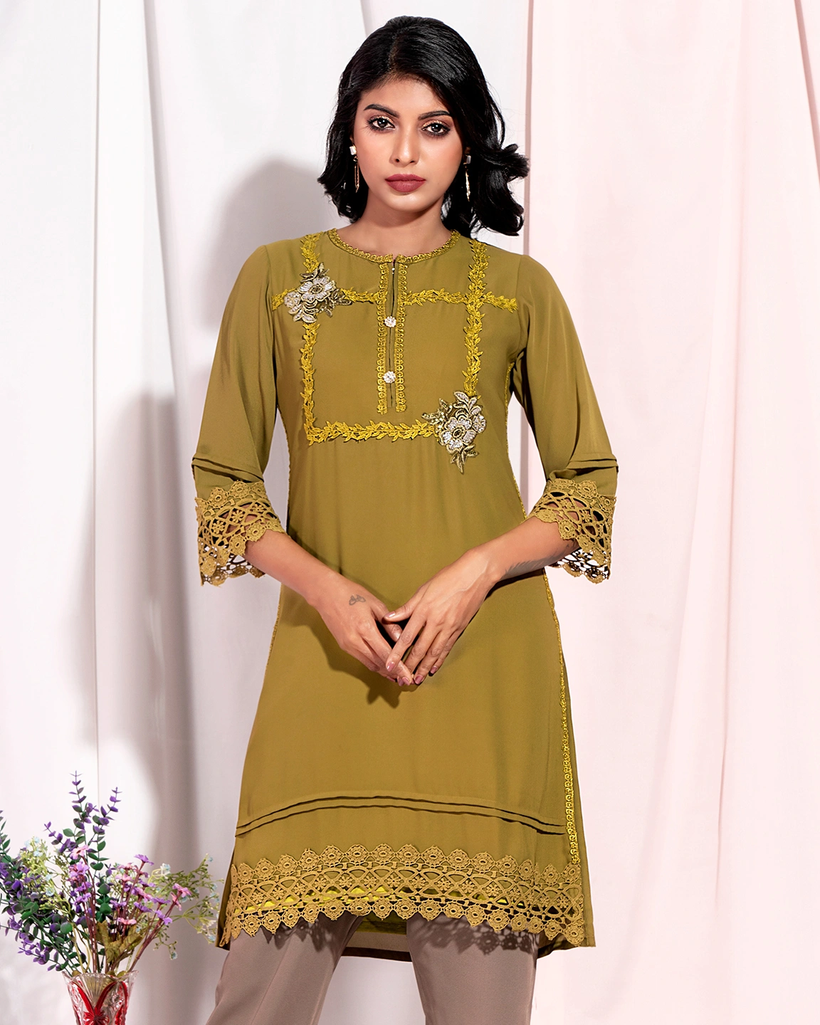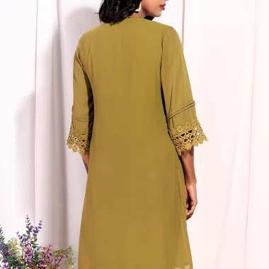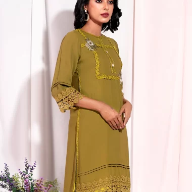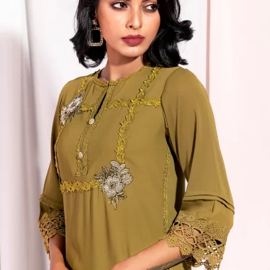 Sold OutFemale Hand Embroidery and Lace Details Short Kameez | Olive Green