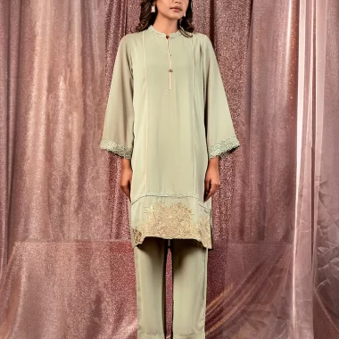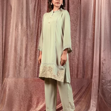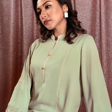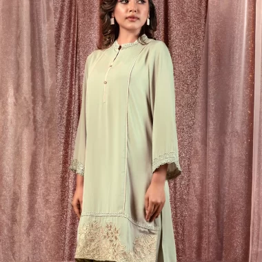 Female Band-Collar with Lace details Long Kameez | Beryl Green