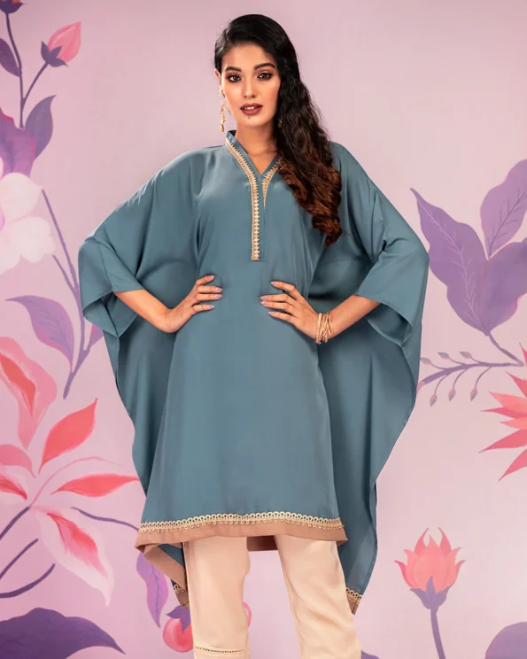 Sold OutFemale Kaftan With Contrast Panel and Lace Details | Deep Sea