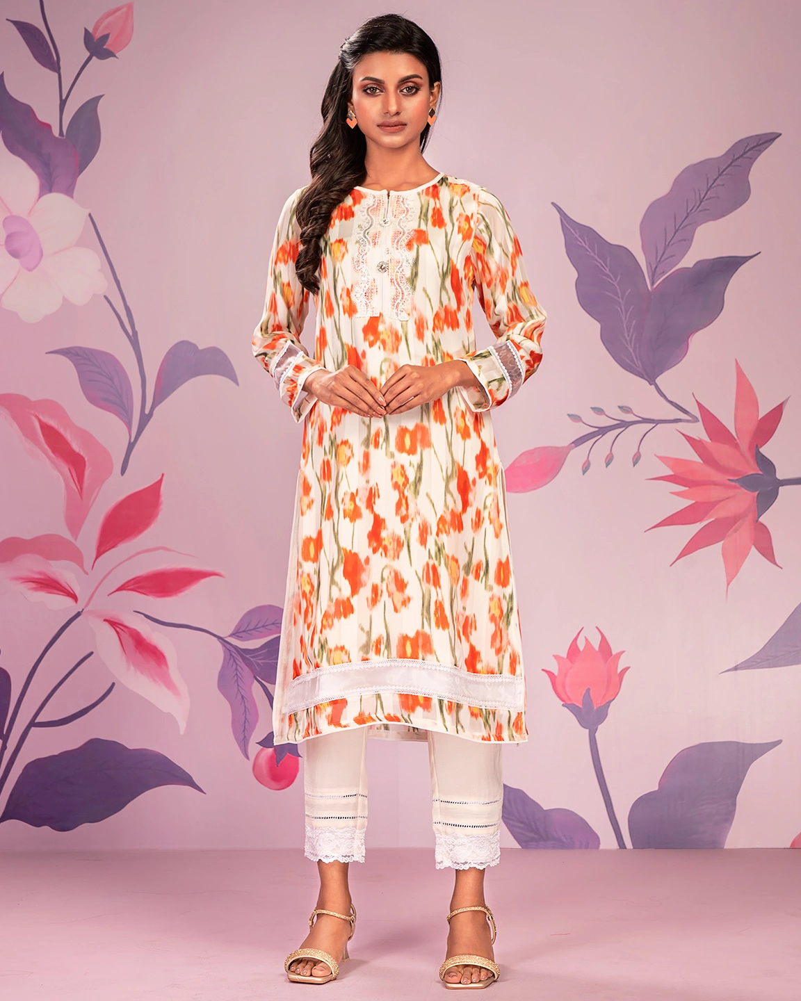 Sold OutFemale Lace Details Long Kameez | Cream White