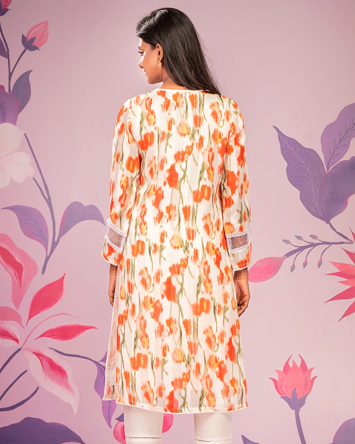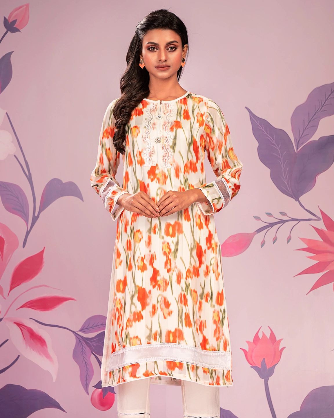 Georgette long kamiz has round neck with contrast pippin & lace details, front hem has contrast & lace details, has full sleeve with contrast tissue & lace details, has butter lining for easy & comfort.
