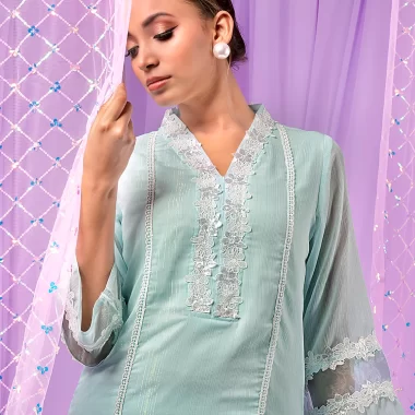 Female Band-Collar with Lace details Long Kameez | Beryl Green