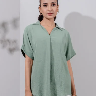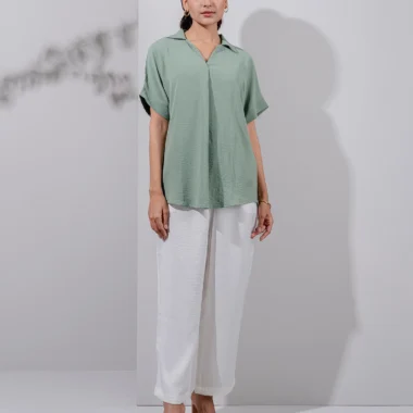 Rayon Loose Fit casual top has cubans collar details, has center front one side pleat details, has short sleeve details, has curve hemline.