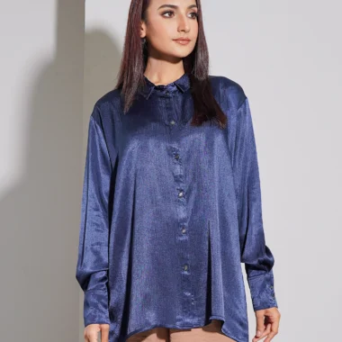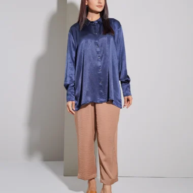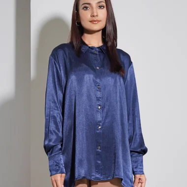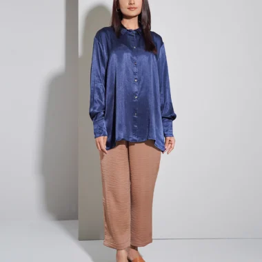 Luxuary Double Silk Casual tops has band collar neck details, has center front placket with button details, has full sleeve details, has shoulder drop details, has straight hemline.