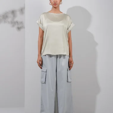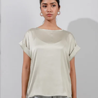 Premium Silk Loose Fit casual top hasround neck details, has short sleeve style with folding details, has no shoulder and armhole details.