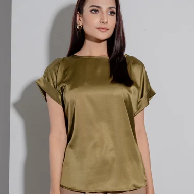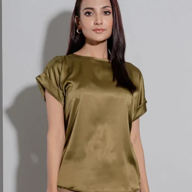 Premium Silk Loose Fit casual top hasround neck details, has short sleeve style with folding details, has no shoulder and armhole details.