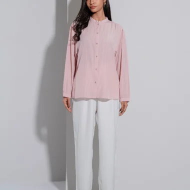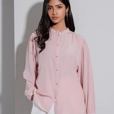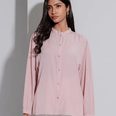 Stripped georgette blend tops has band collar neck details, has center front placket with button details, has front drop shoulder with gather details, full sleeve with gather details, has back yoke and gather details, has curve hemline.