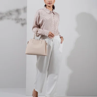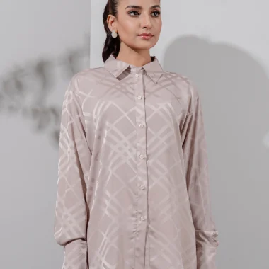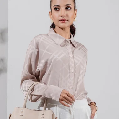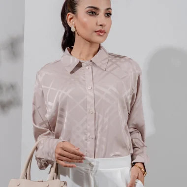 Luxury Double Silk Loose Fit casual top has shirt collar, has center front placket with functional button details, has shoulder drop details, has full sleeve and cuff has button details, has back yoke details, has curve hemline.