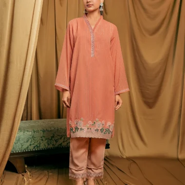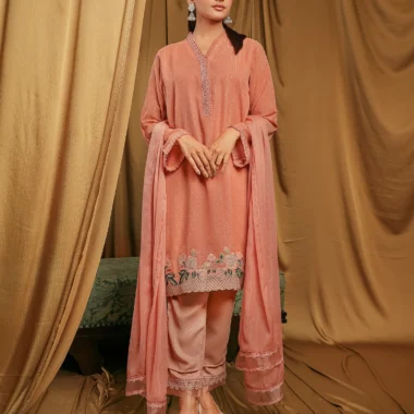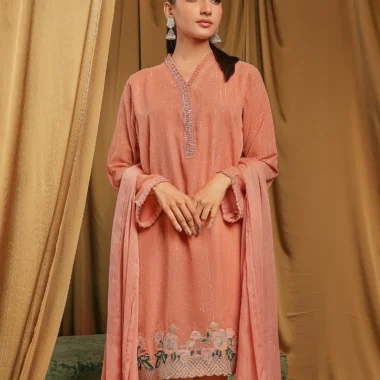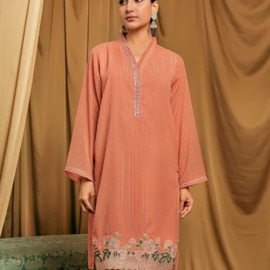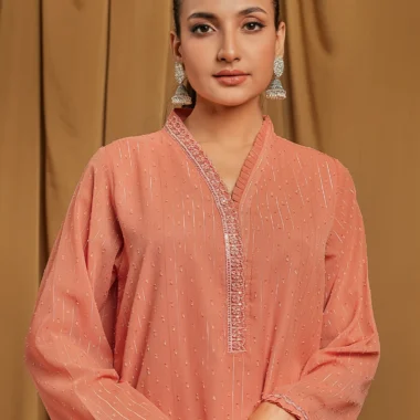 Female Loose Fit V-Neck Details Zari Crepe Georgette Short Kamiz | Coral Blush