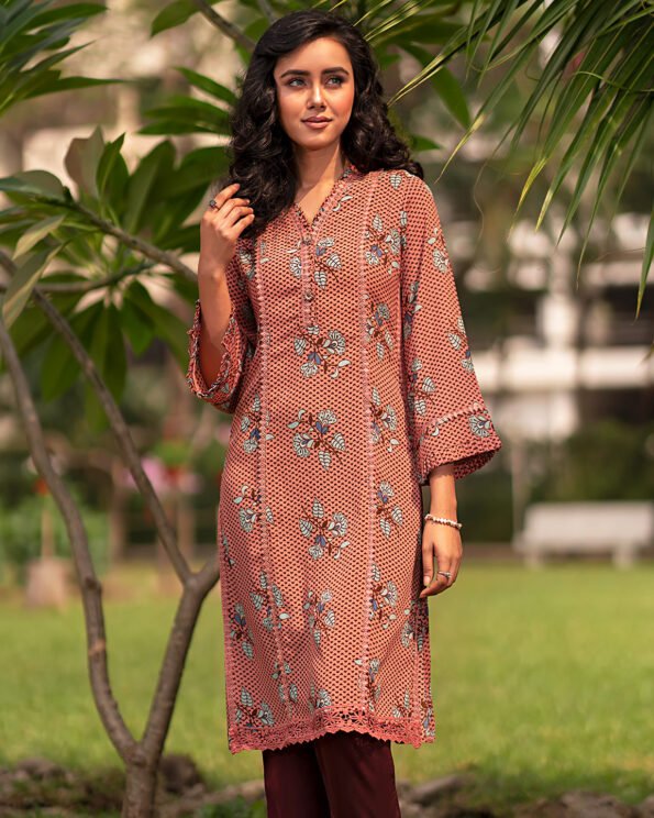 Female Loose Fitted Lace Details Short kameez | Red Cherry Wood