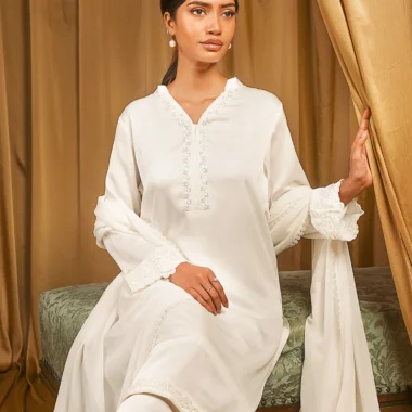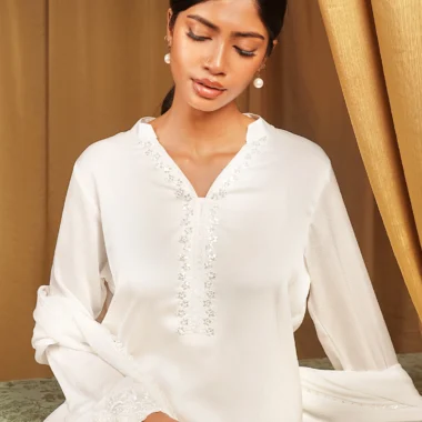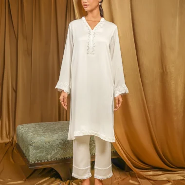 Luxury textured silk straight fit short kamiz has half band collar with v-shaped neckline, neckline has lace details, front hemline has zardosi work details, has full sleeve with hemline has zardosi work details, has both side slits, has butter lining for comfort & easy.