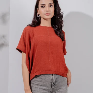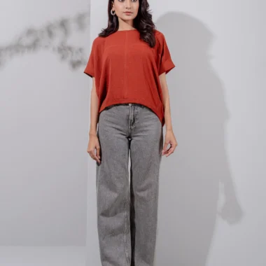 Rayon Loose Fit casual top has round neck details, has center front seam details, has full width details, has back zipper details, has curve ups and down hemline details.