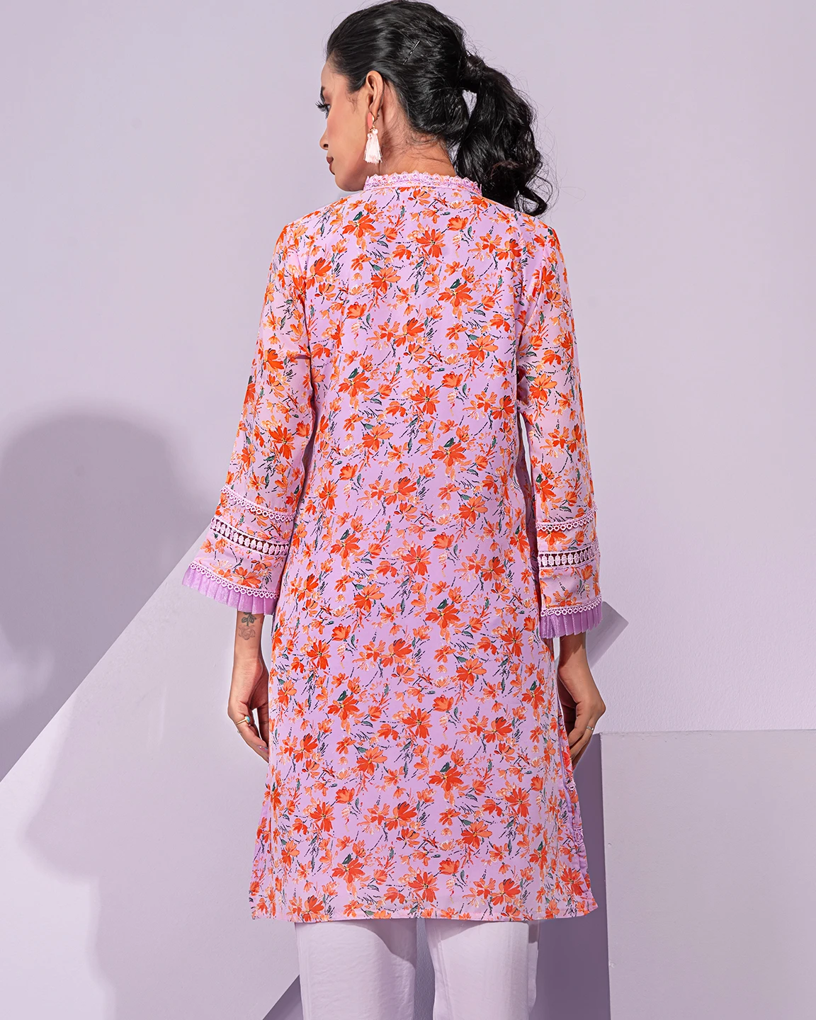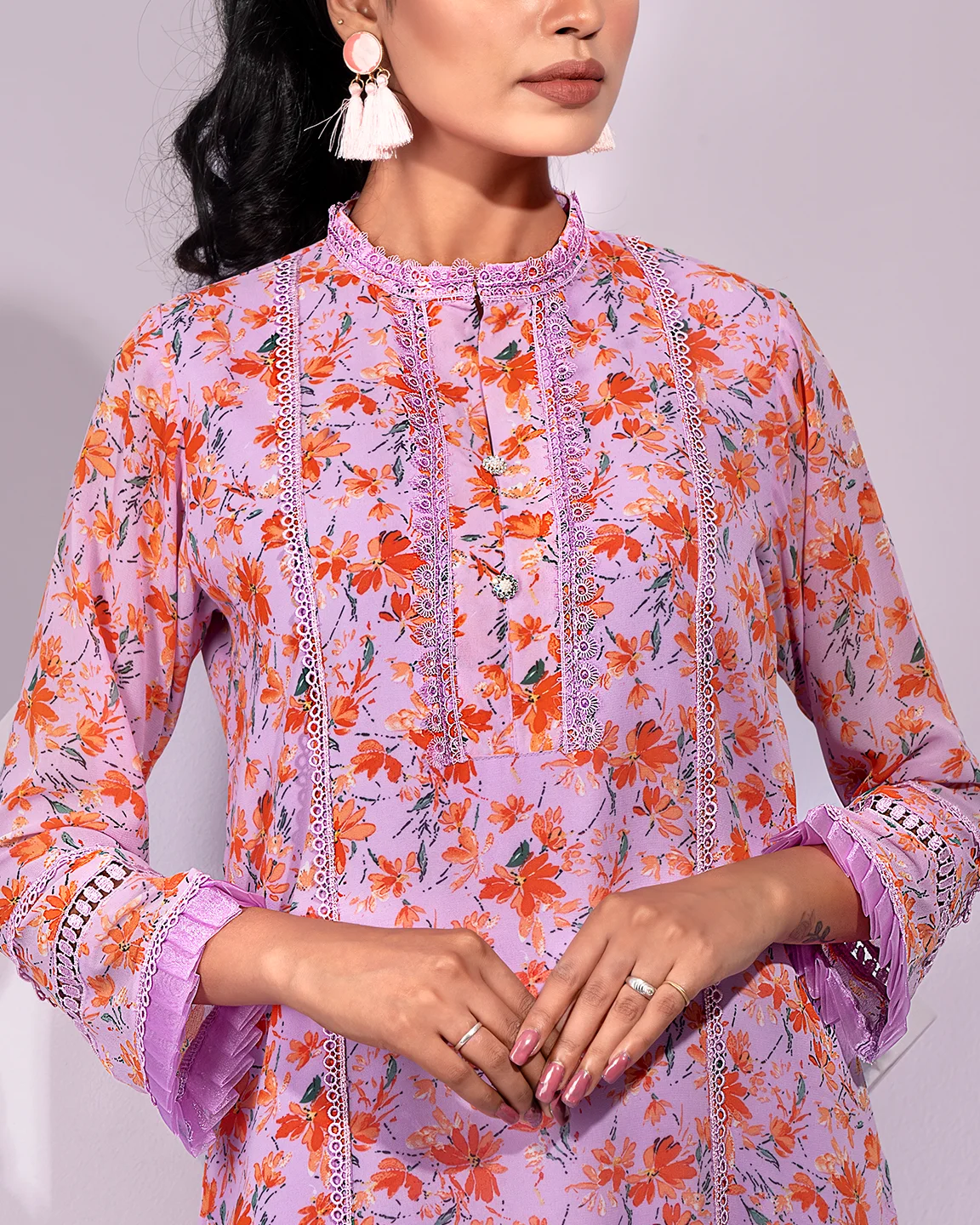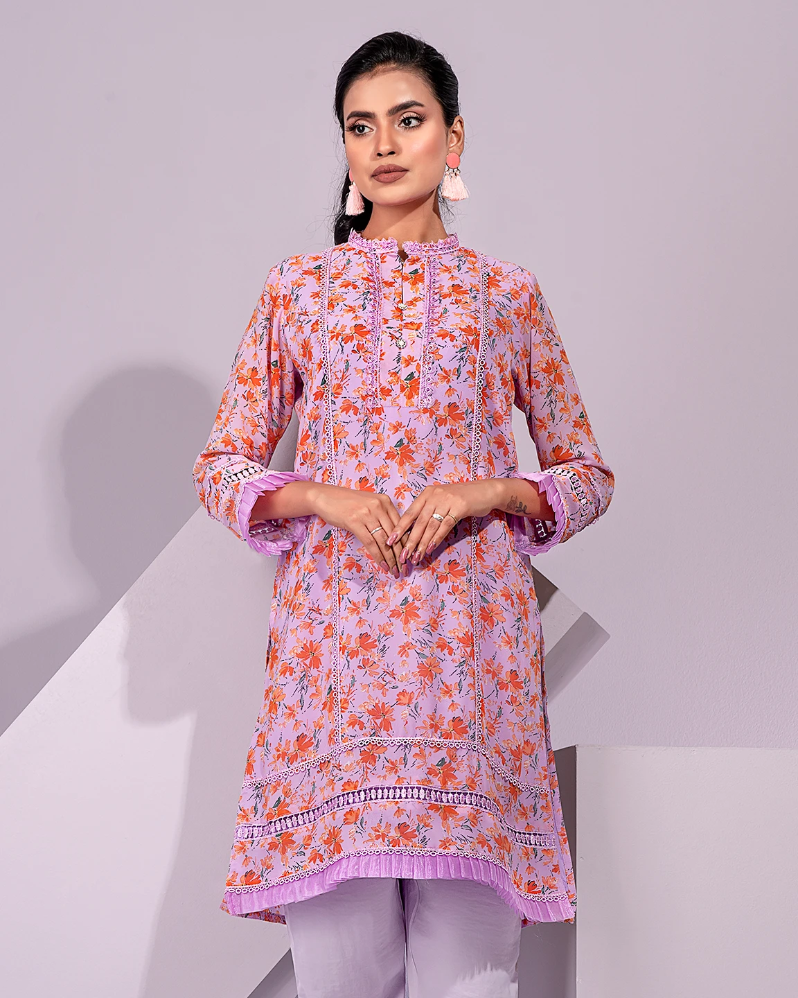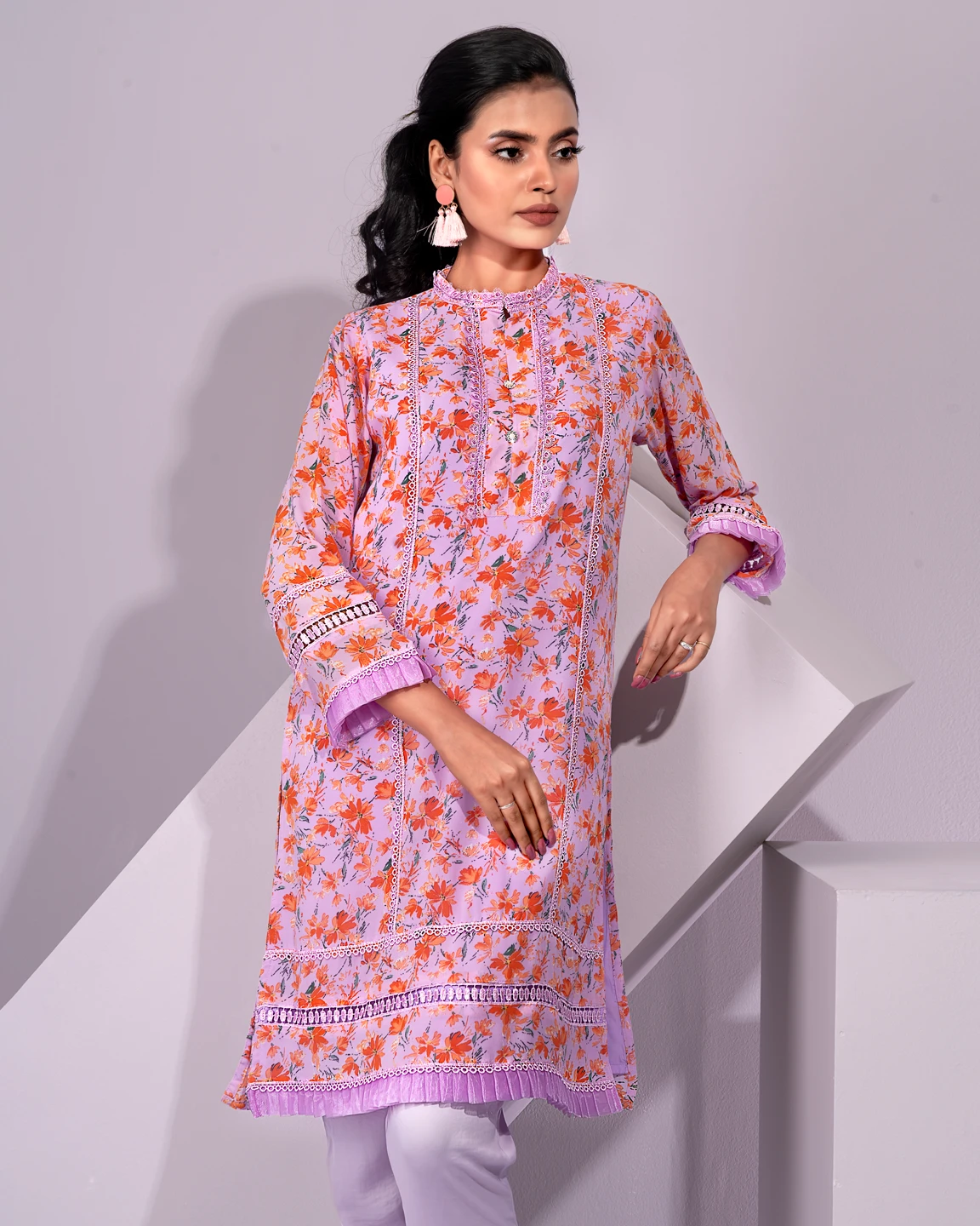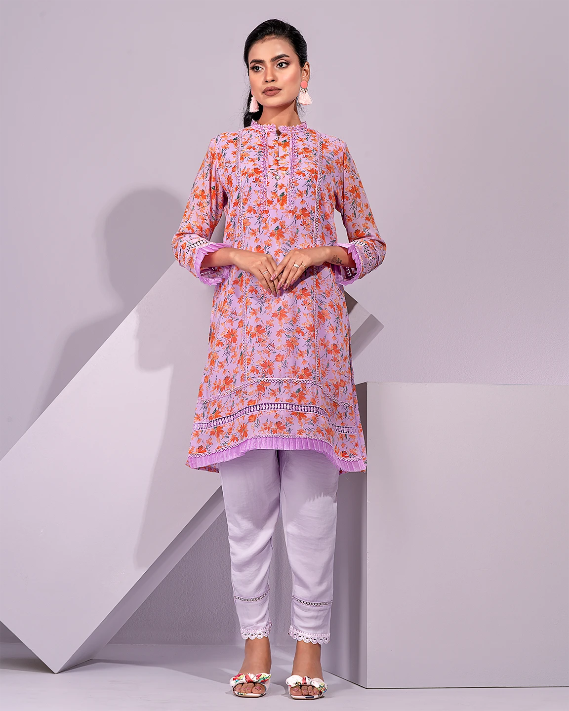 Fine Georgette Short kamiz has band collar with slits with lace details, has button details, has princessline lace details, hemline has contrast ruffle, has hemline join lace details, has bothside slits, has full sleeve with contrast ruffle with lace details, has butter lining for easy & comfort.