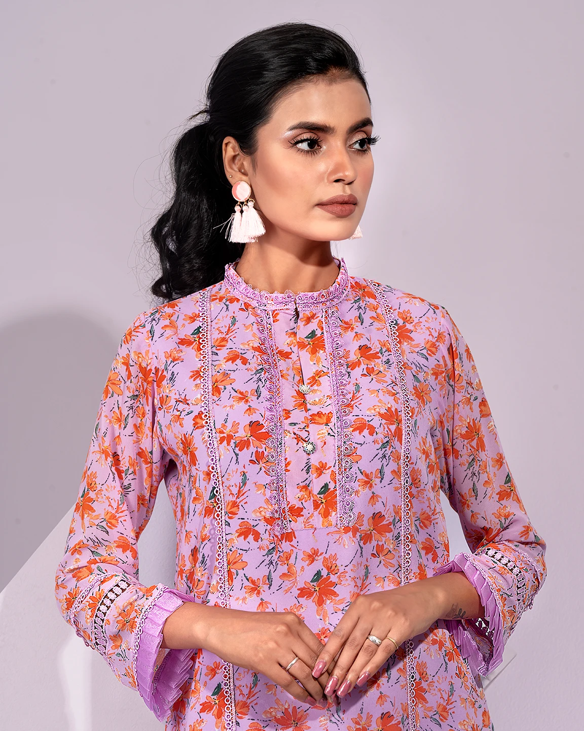 Female Princessline Lace Details & Hemline Contrast Ruffle Short Kamiz | Lavender Pink