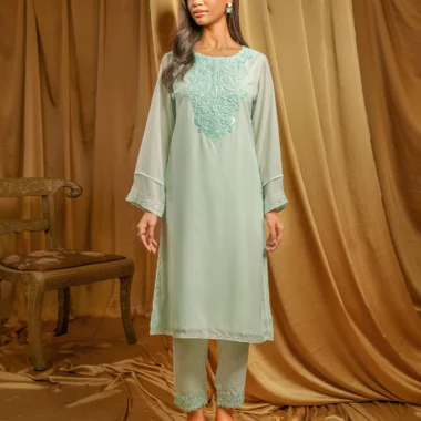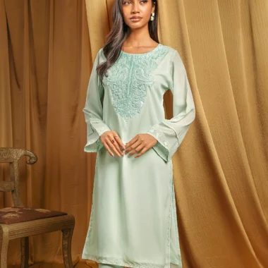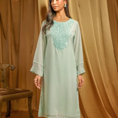 Luxury Georgette regular fit long kamiz has round neck details, front neckline has hand embroidery and karchupi work details, side panel has lace details, has full sleeve with lace and pin tack details, has back yoke with lace details, has both side slits with attached lining for comfort & easy.