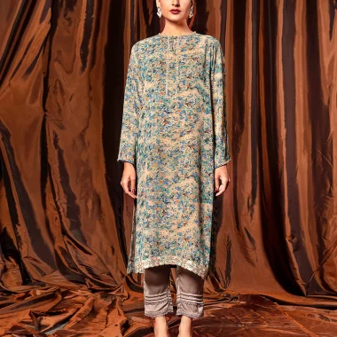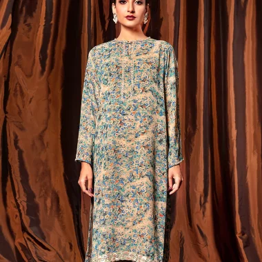 Fine Crepe Georgette Long Kameez has Round – Neck with functional loop button, neckline has lace details, has hemline lace details, has full sleeve with loop button & lace details, has both side slits, has butter lining for comfort & easy.