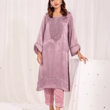 Luxury Double Silk Long Kameez has Round-neck details, Neckline has hand embroidery with karchupi beads work details, has full sleeve with join lace details, has back yoke with lace details, hemline has join lace details, has both side slits details.