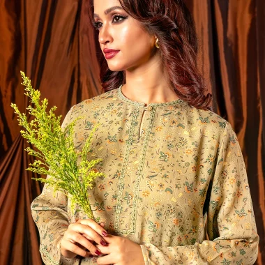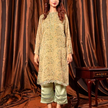 Fine Crepe Georgette Long Kameez has Round – Neck with functional loop button, neckline has lace details, has hemline lace details, has full sleeve with loop button & lace details, has both side slits, has butter lining for comfort & easy.