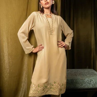 Fine Crepe Georgette Short kameez has Round-neck with lace details, has full sleeve with lace details, has hemline has hand embroidery work details, back side has zipper details, has side slits details, has butter lining.