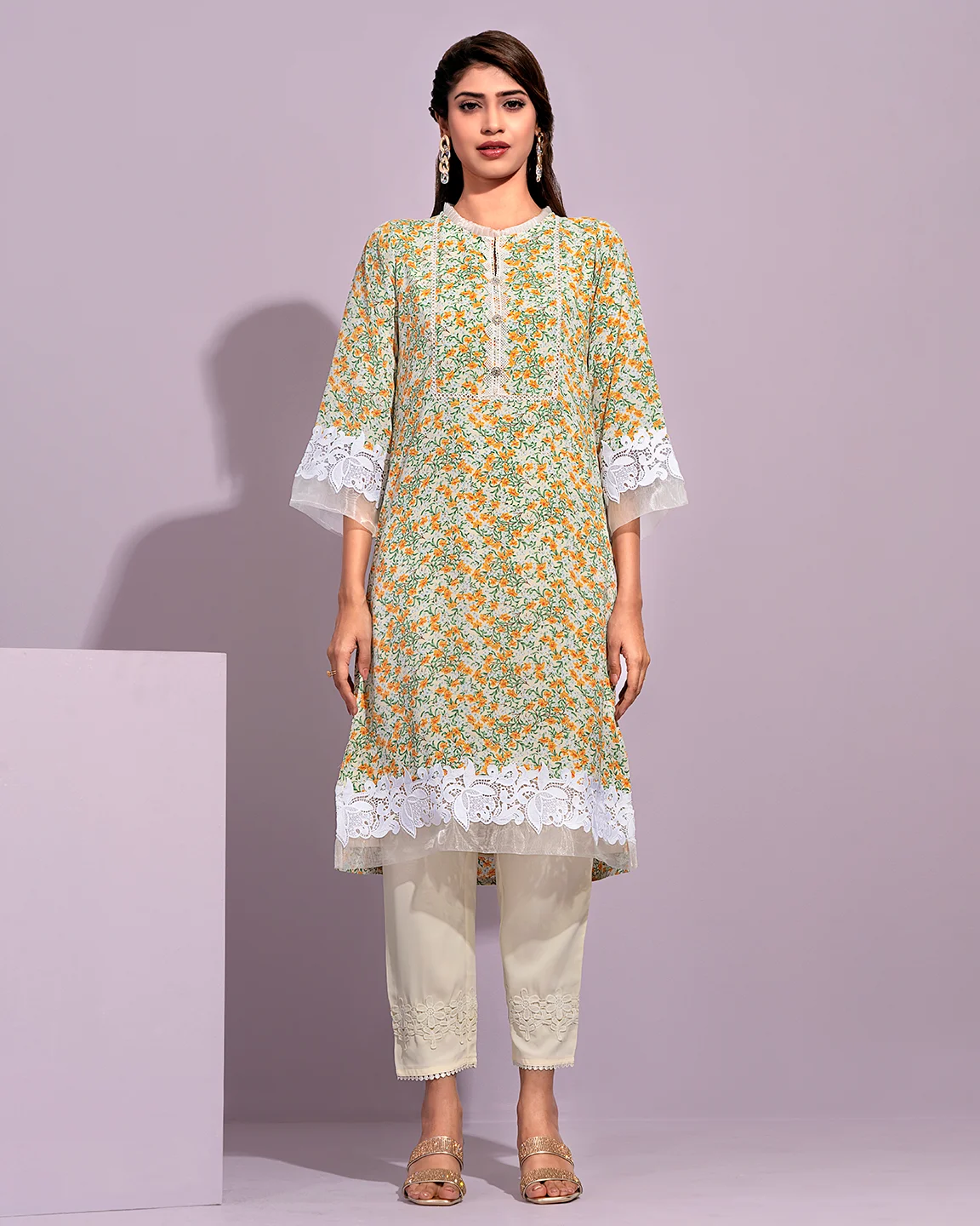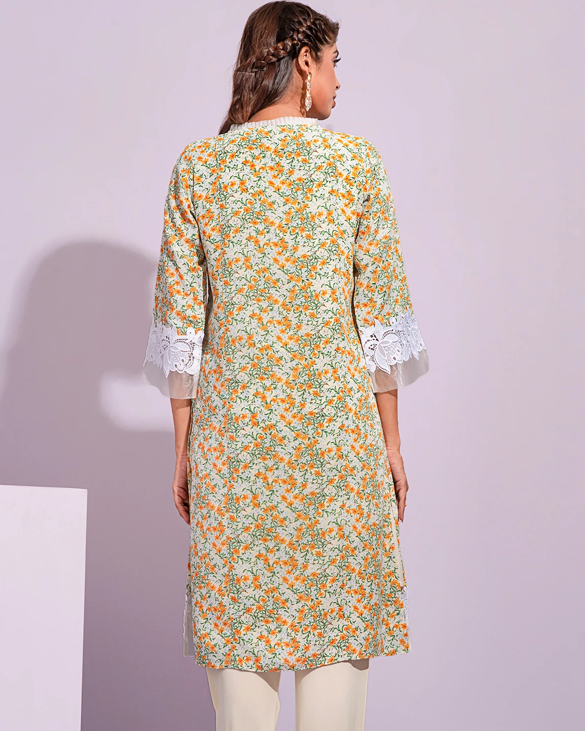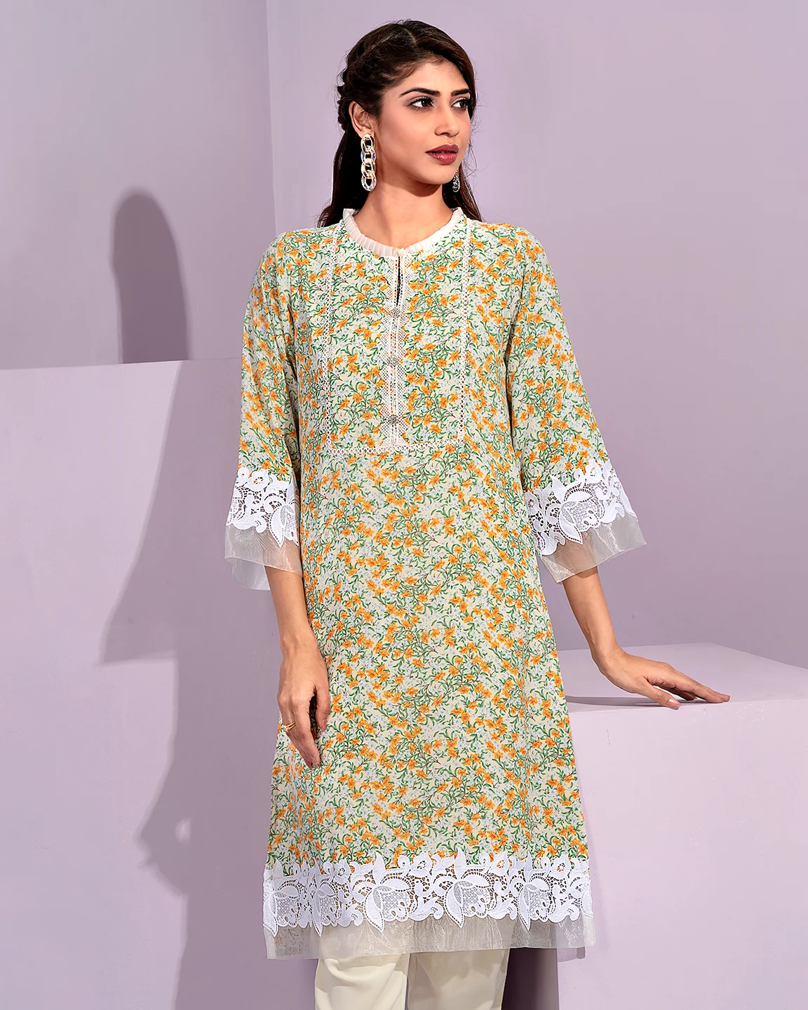 Female Round- Neck Lace & Details Long Kamiz | Yellow Cream