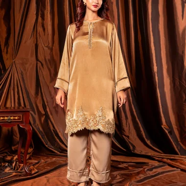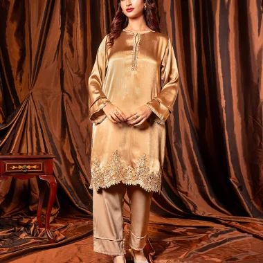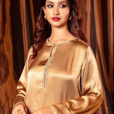 Luxury Double Silk short kameez has round neck with key hole & lace details, neckline has lace details, has front hemline embroidery lace details, has full sleeve with pin tuck & lace details, has both side slits.