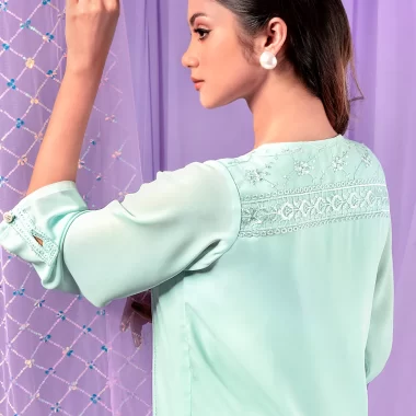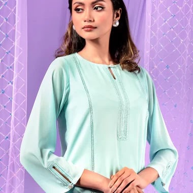 Female Round- Neck With placket Lace Details Short Kameez | Pastel Green
