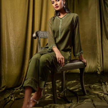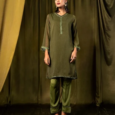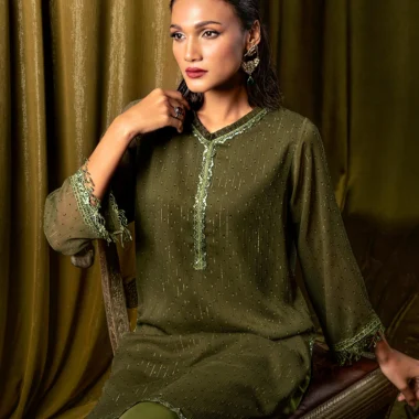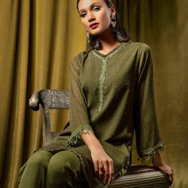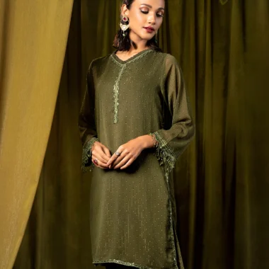 Female Ruffled V-neck Short Kameez | Army Green