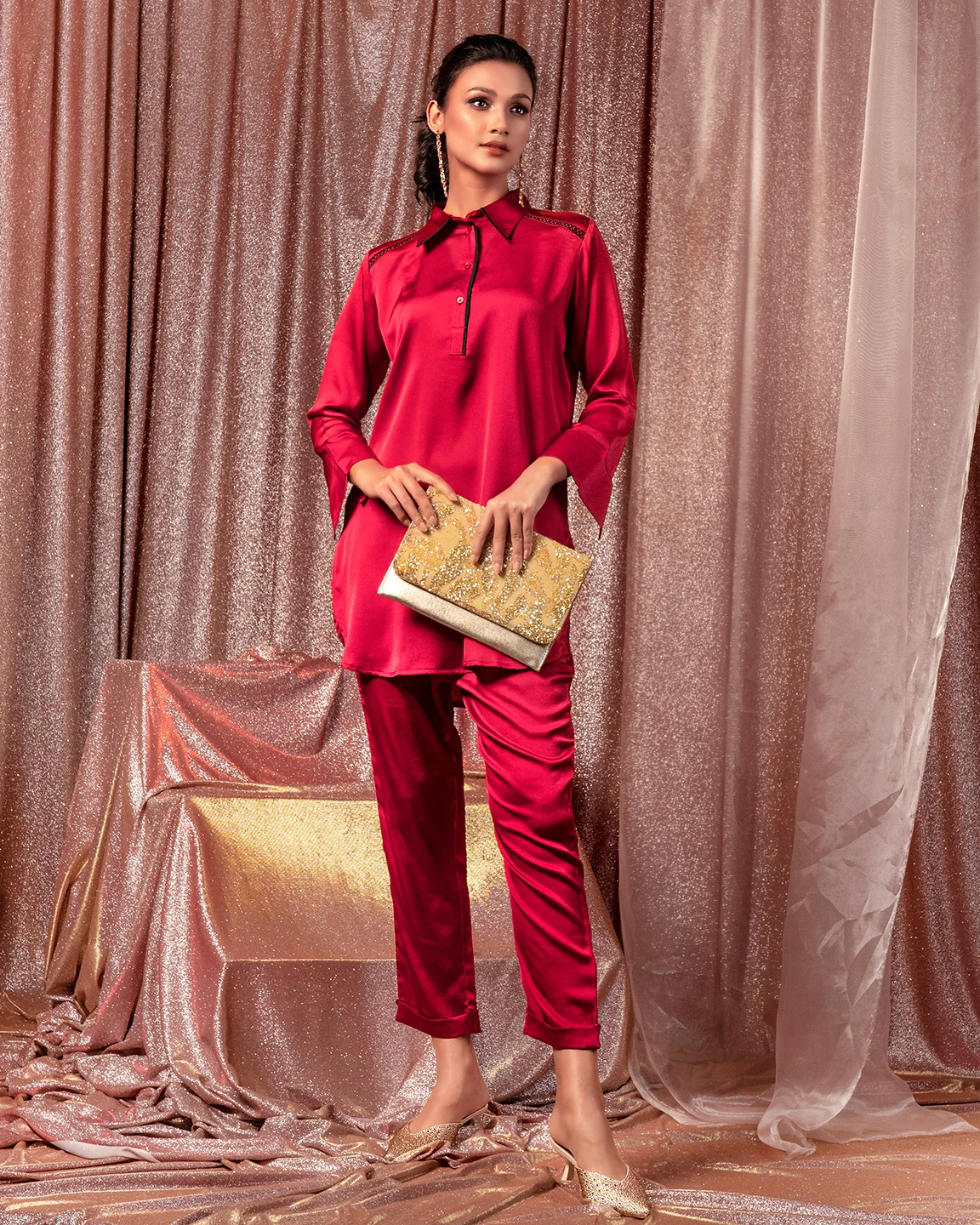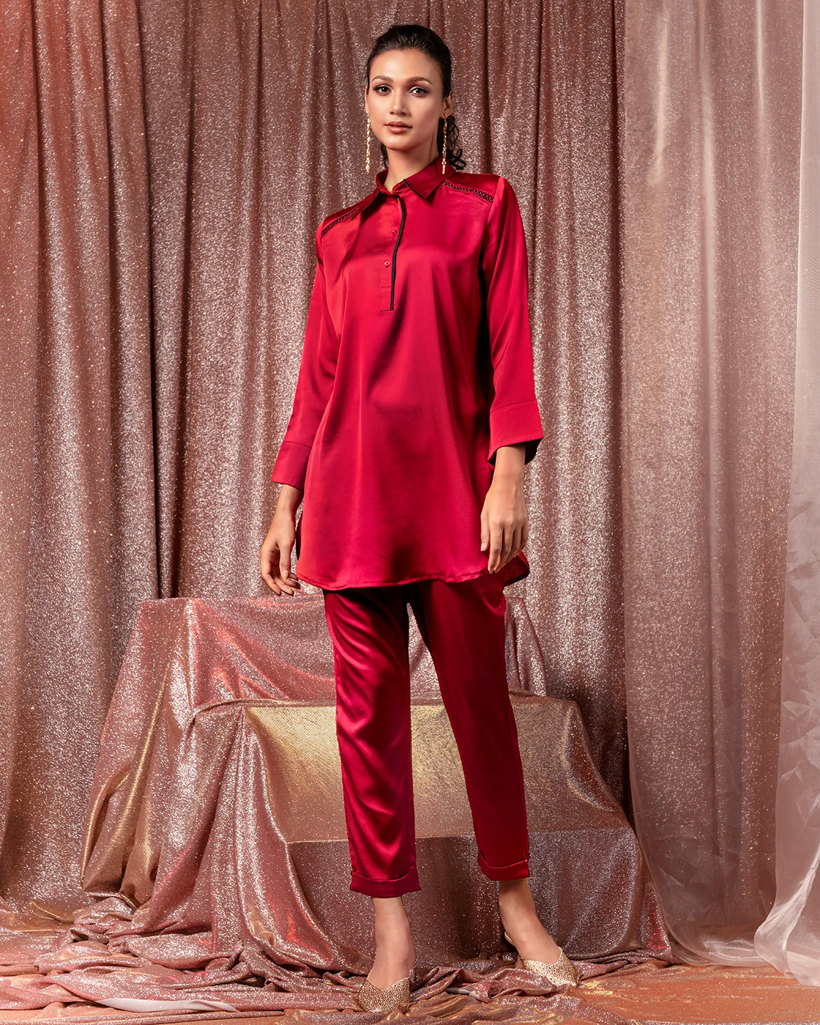 Female Shirt Collar With contrast piping Co-Ord Set | Burgundy Red