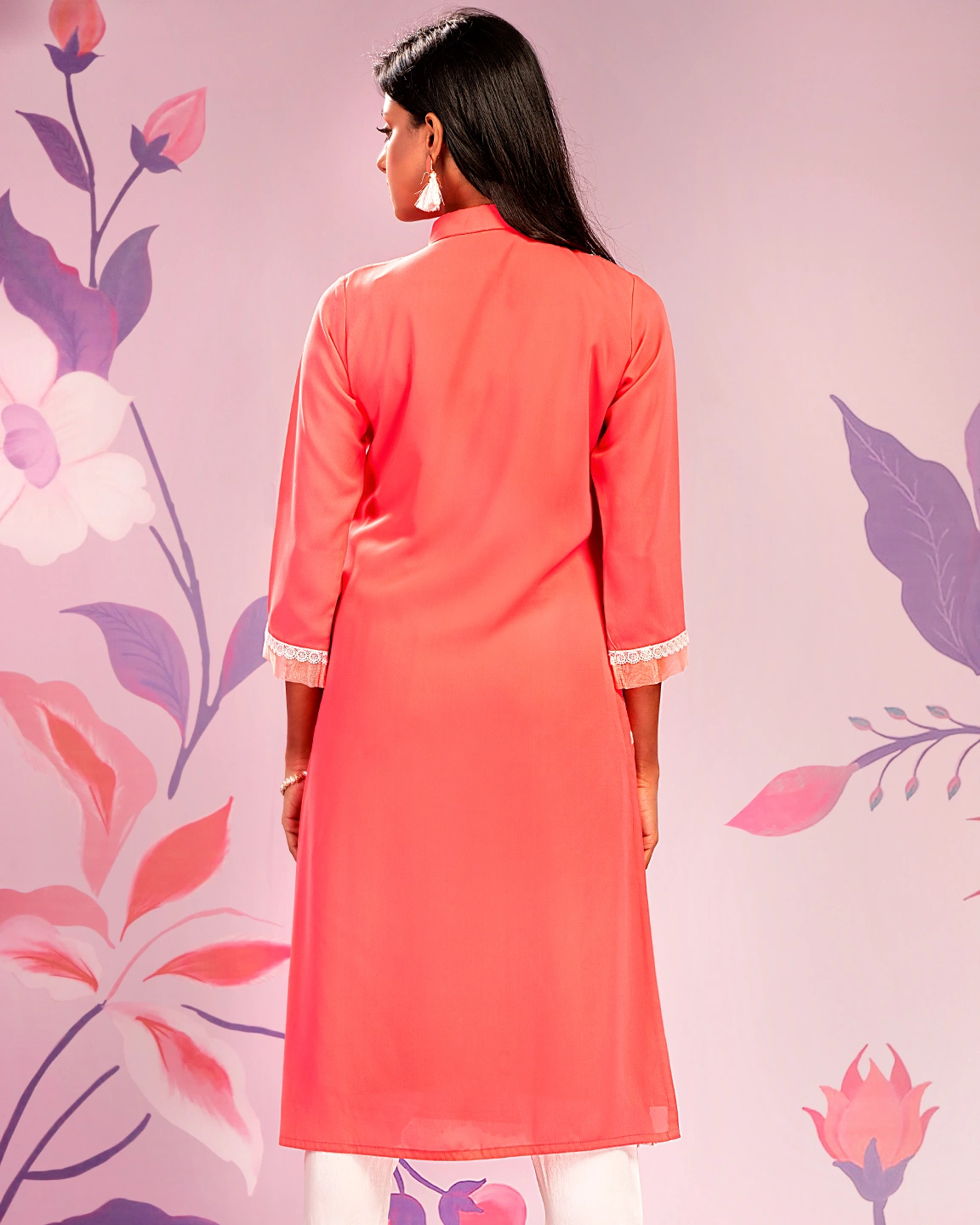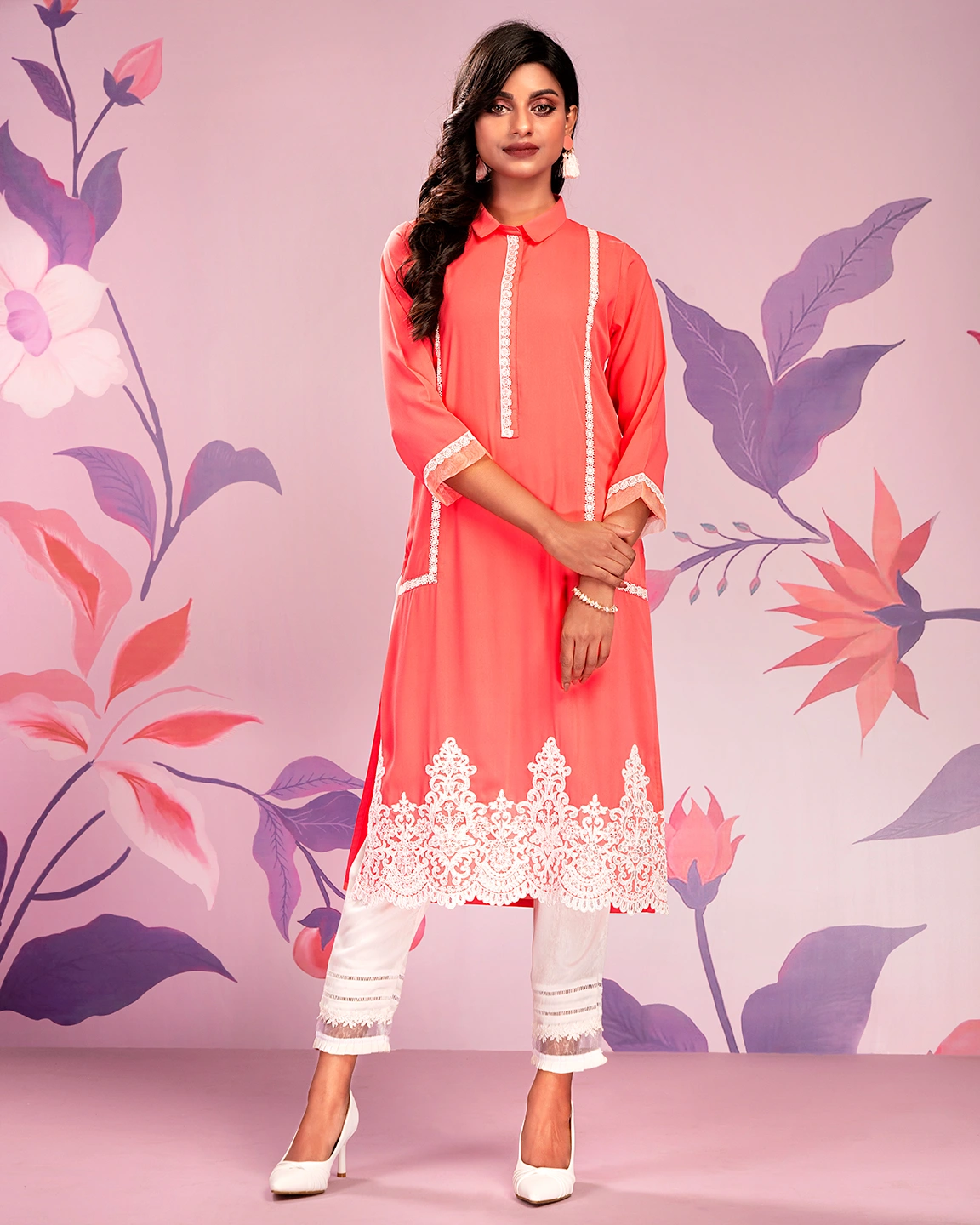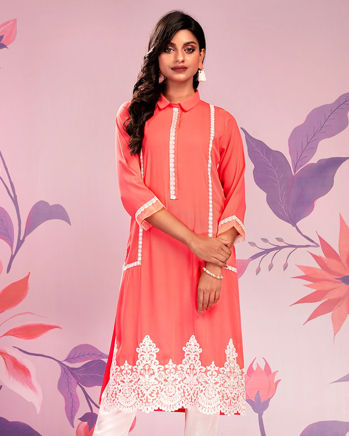 Sold OutFemale Shirt Collar With Lace Details Long Kameez | Coral Pink