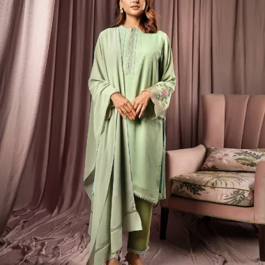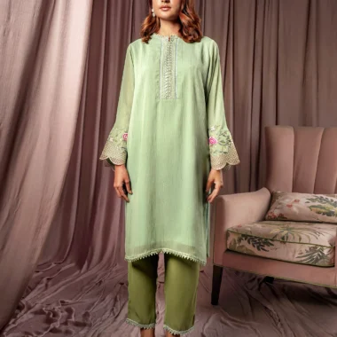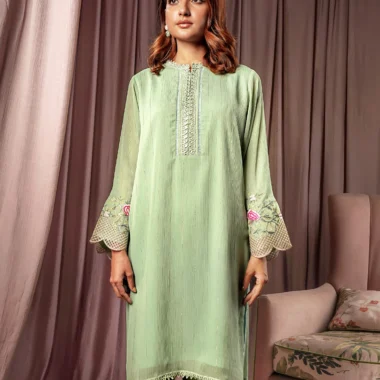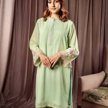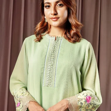 Female Straight Fit Round- Neck Details Zari Crepe Georgette Short Kamiz | Asparagus Green