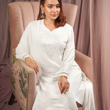 Luxury textured georgette long kameez with sweetheart neckline and detailed white thread floral motif embroidery around. Sleeve has tissue, ruffle & lace details. Hemline has lace and ruffle details.