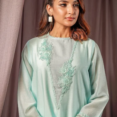 Momo Check Nylon Straight Fit Short Kameez has round neck with lace Details, has front yoke contrast with hand embroidery and karchupi work details, has full sleeve with karchupi work details, hemline has contrast and lace details, both side slits has lace details, has attached lining for comfort & easy.