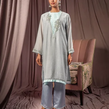 Momo Check Nylon Straight Fit Short Kameez has round neck with lace Details, has front yoke contrast with hand embroidery and karchupi work details, has full sleeve with karchupi work details, hemline has contrast and lace details, both side slits has lace details, has attached lining for comfort & easy.