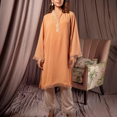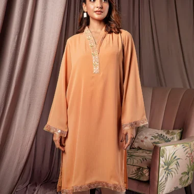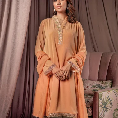 Female Straight Fit V- Neck Details Luxury Zari Crepe Georgette Short Kamiz | Apricot