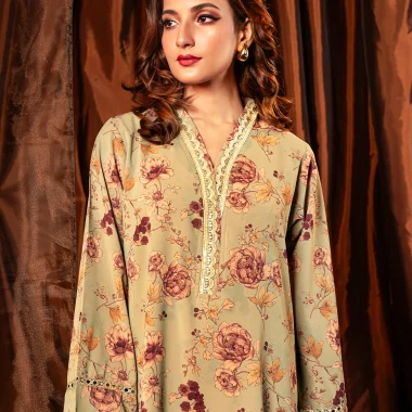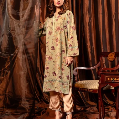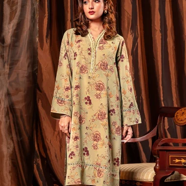 Luxury Printed Georgette Long Kameez has V-neck details, neckline has karchupi work details, front hemline has join lace details, has full sleeve with join lace details, has side slit for easy to wear.