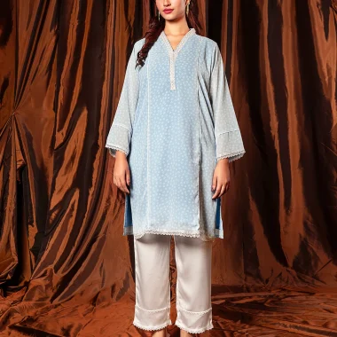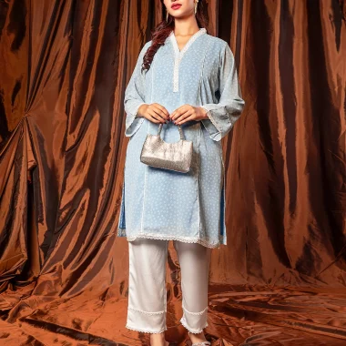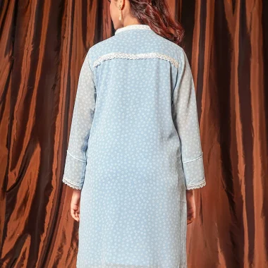 Fine Georgette Short Kameez has V-Neck with hand embroidery and karchupi work details, has front princess line has contrast piping details, has full sleeve with lace and contrast piping details, hemline has lace details, has back yoke with lace details, has both side slits, has butter lining for comfort & easy.