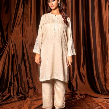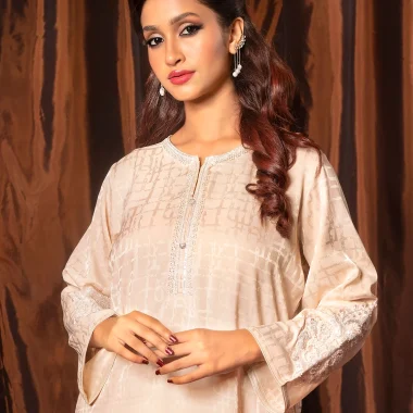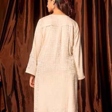 Luxury Double Silk Short kameez has V-neck with lace details, hemline has contrast piping details, has full sleeve hemline has contrast piping and sleeve has hand embroidery with karchupi work details, back side has back yoke with lace and box pleat details, side slits has lace details, has butter lining for easy & comfort.