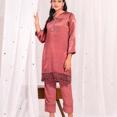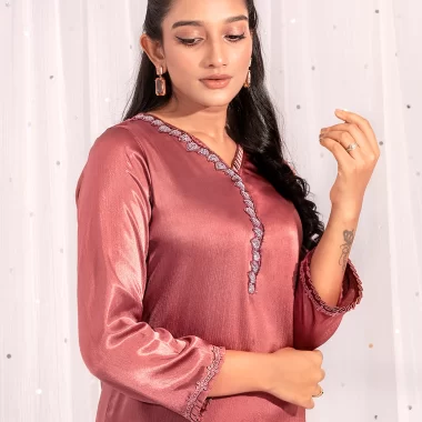 Female V- Neck Details Short Kameez | Mauvwood Pink