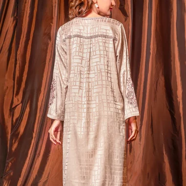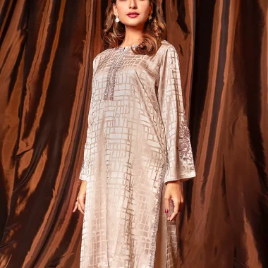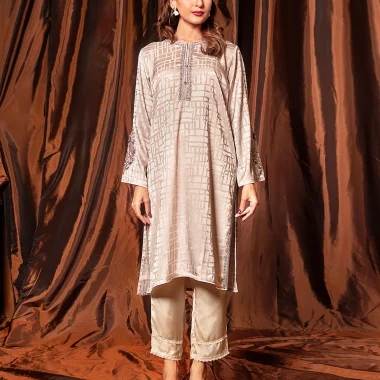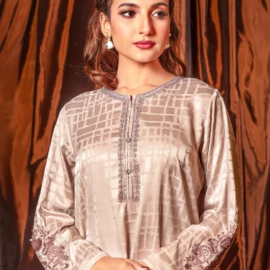 Luxury Double Silk Short kameez has V-neck with lace details, hemline has contrast piping details, has full sleeve hemline has contrast piping and sleeve has hand embroidery with karchupi work details, back side has back yoke with lace and box pleat details, side slits has lace details, has butter lining for easy & comfort.