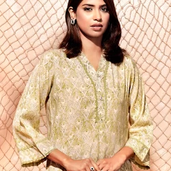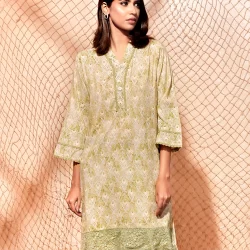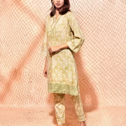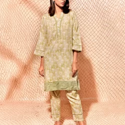 Printed cotton co-ord kurta & bottom set by AMNA | Light Green