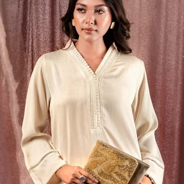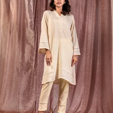 Female V-neck With Ruffle & Lace Details Short Kameez | Cream