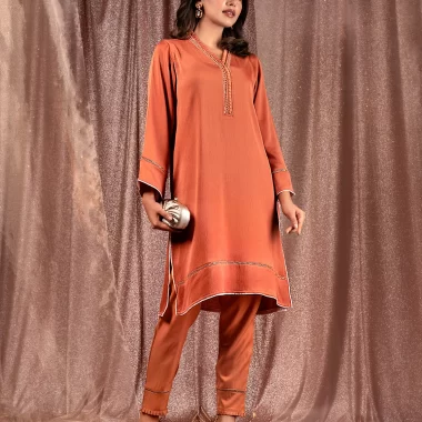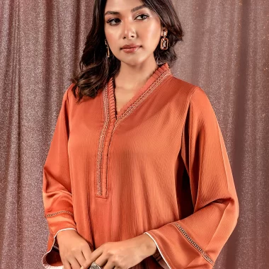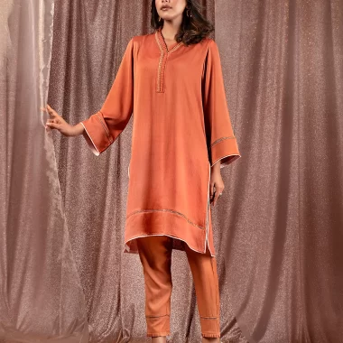 Luxury Double Silk Short kameez has V-neck with ruffle & lace details, front hemline has join lace details, has both side slits, both side slits & hemline has contrast piping, has full sleeve with join lace details & hemline contrast piping, back yoke has contrast piping’.