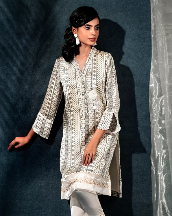Sold OutFemale V-Neckline With Embroidery Short Kamiz | Off White