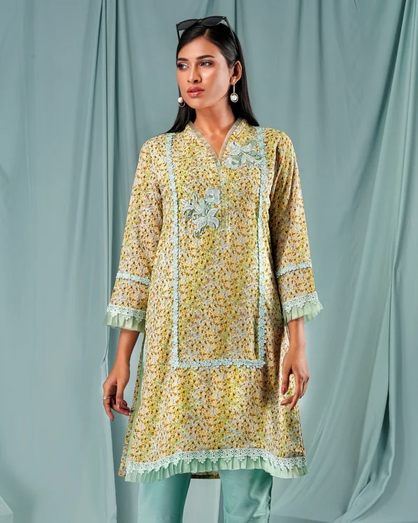 Georgette short kamiz has v-neck with tissue, has neckline hand embroidery work, front part has lace details, front hemline has tissue ruffle with lace details, has full sleeve tissue ruffle with lace details, has bothside slits, has butter lining for easy & comfort.