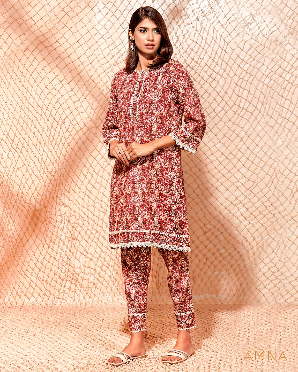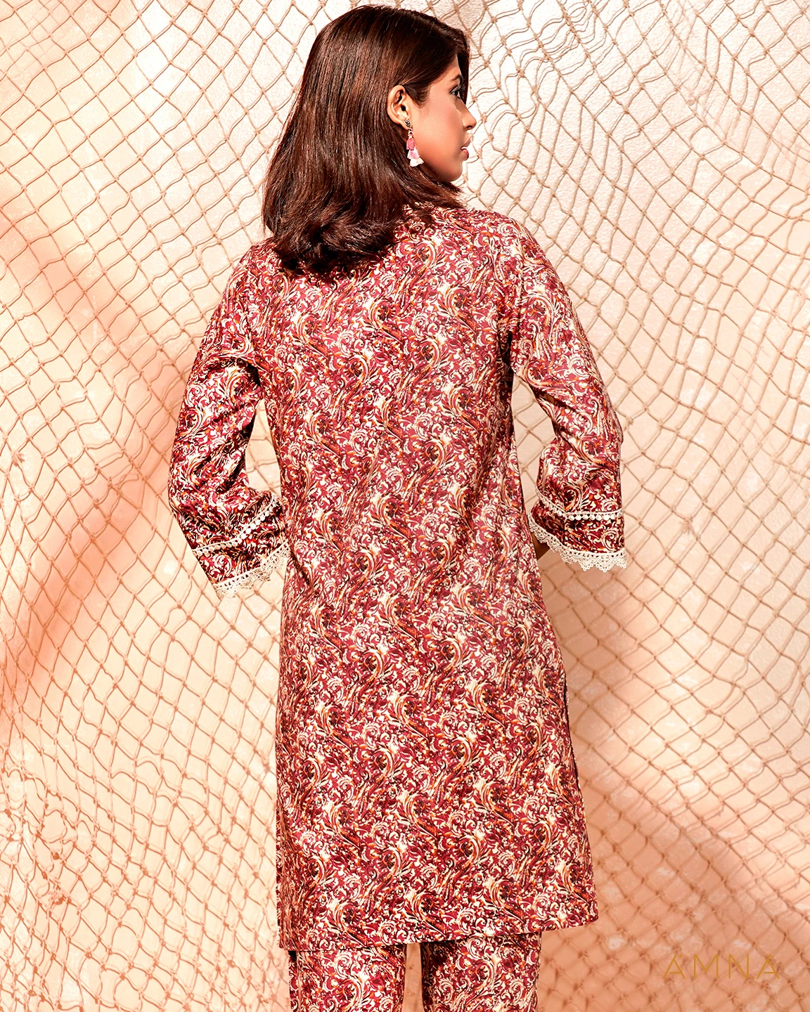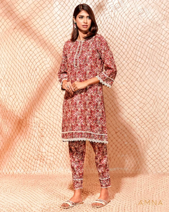 Sold OutPrinted cotton co-ord kurta & bottom set by AMNA | Aggie Maroon
