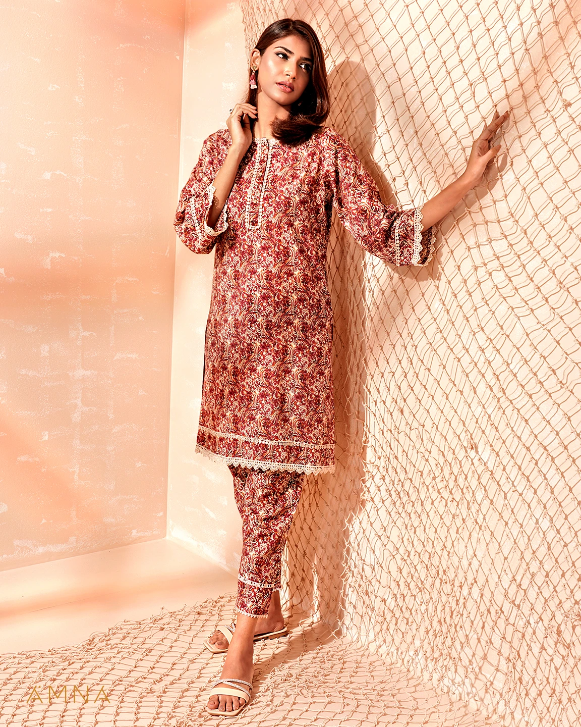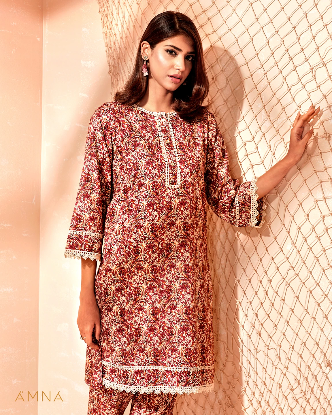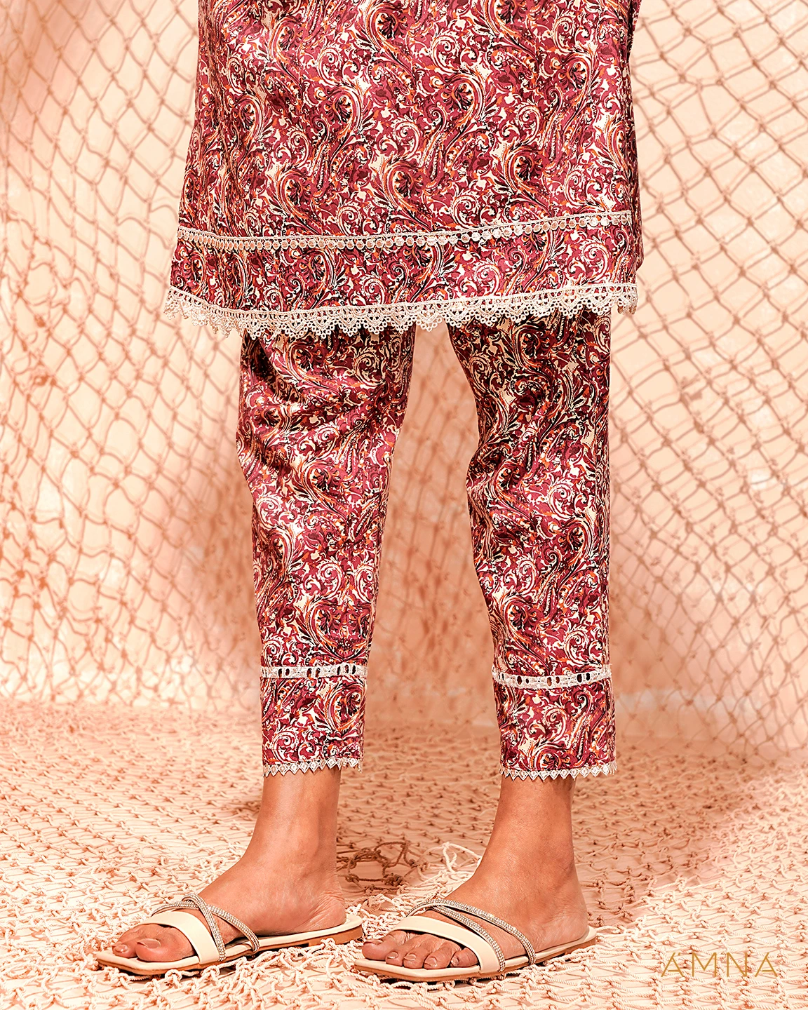 Sold OutPrinted cotton co-ord kurta & bottom set by AMNA | Aggie Maroon