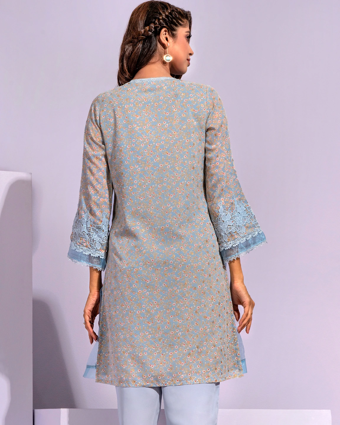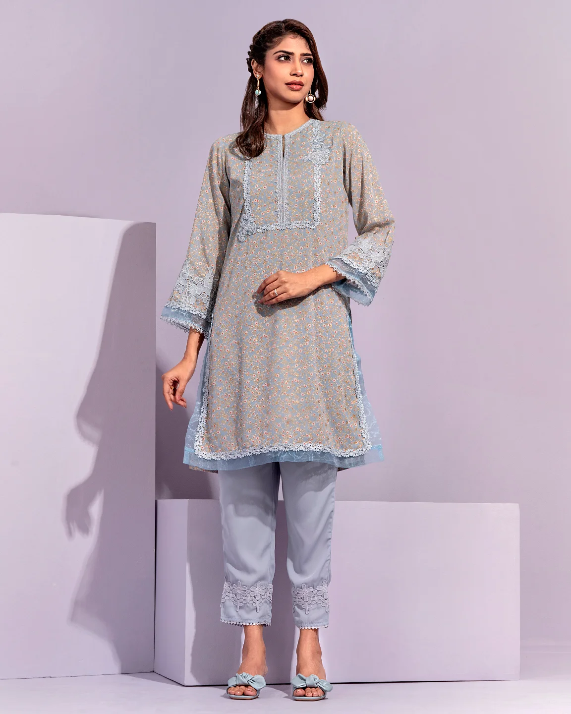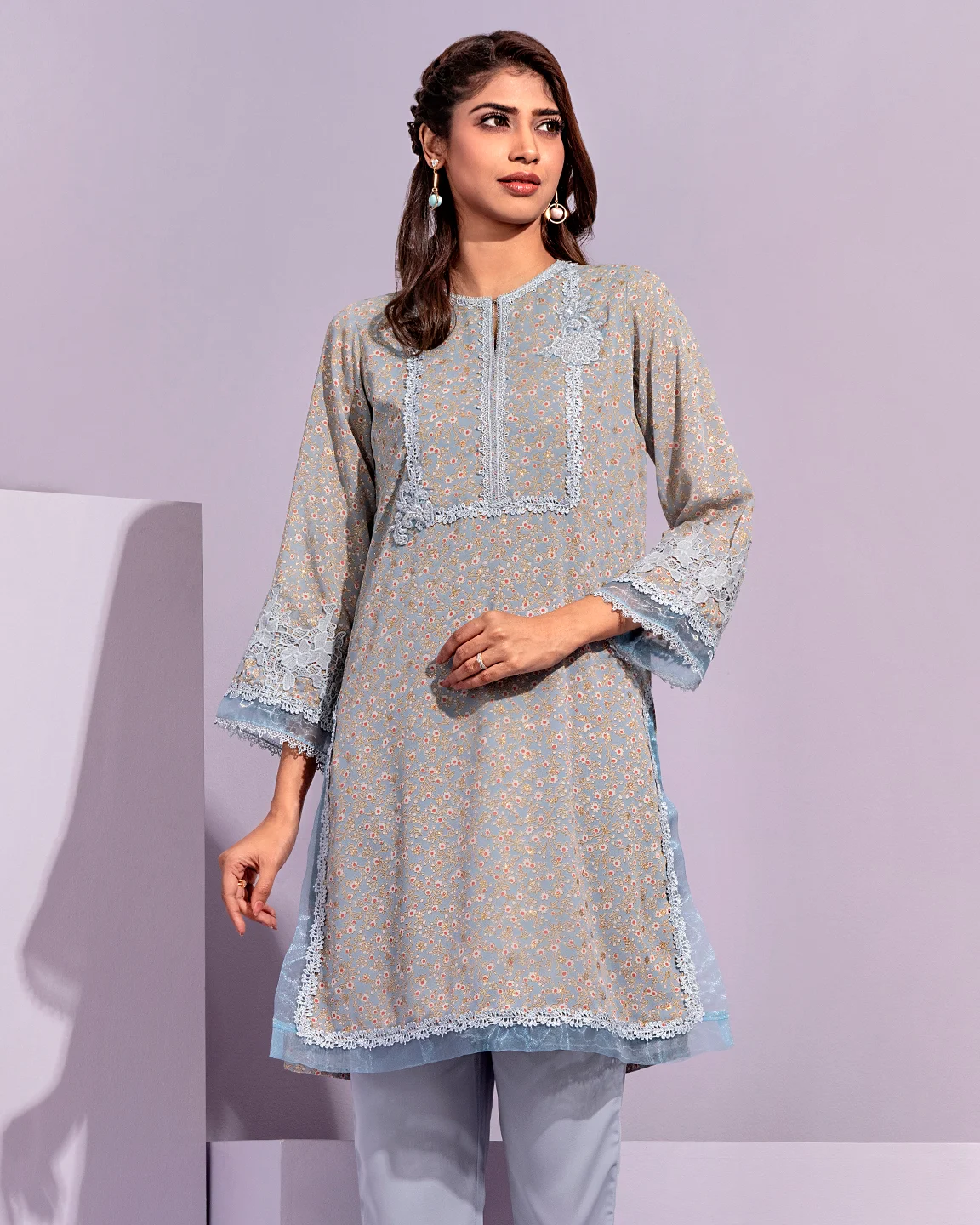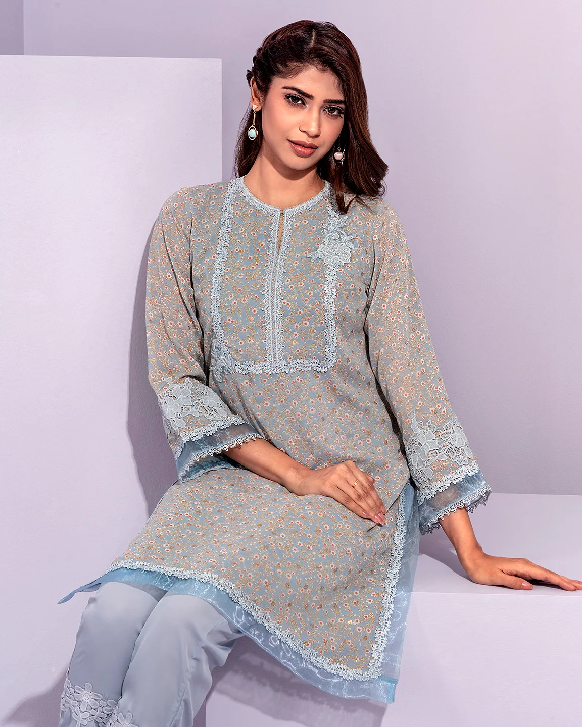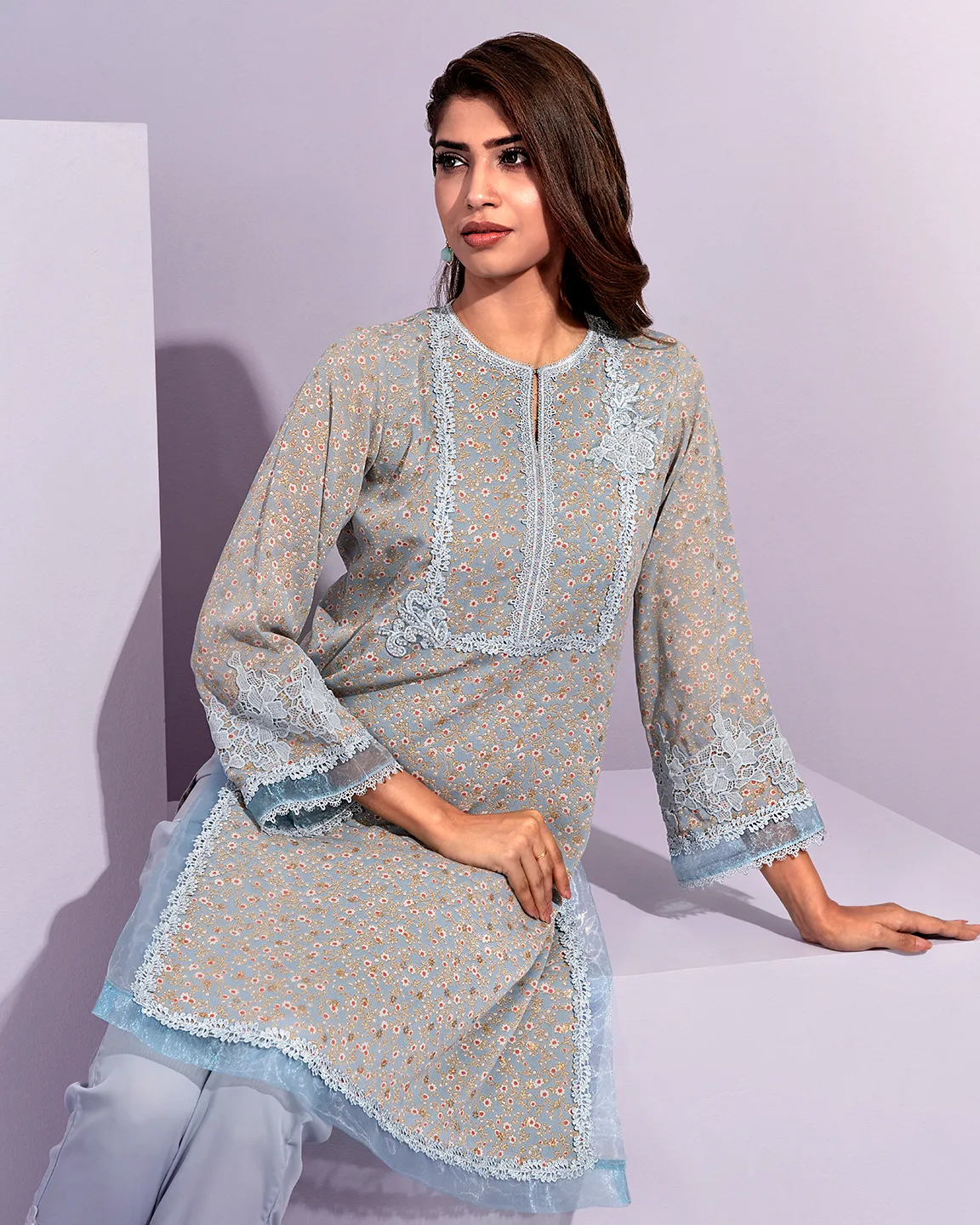 Fine Zari Crepe Georgette Short kamiz has round neck with lace details, has front yoke lace details & hand embroidery work, front side panel has contrast with lace details, has full sleeve with hemline contrast panel with lace details, has bothside slit, has butter lining for easy & comfort.